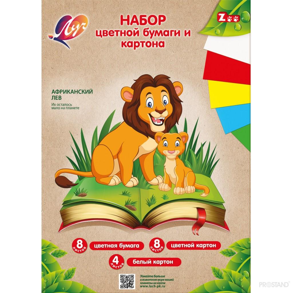 Набор цветной бумаги и картона (8 цв.бум.+8 цв.кар.+4 бел.картона) "ZOO A4, 20 листов (Лев) 31C 1958-08 Луч /30